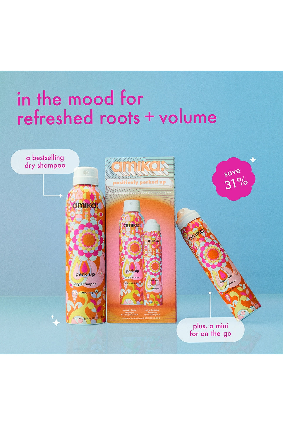 Free of parabens, phthalates, and sulfates - Positively perked up features a full size + travel size of amika's best selling perk up dry shampoo to leave your hair feeling clean while adding volume + refreshing roots