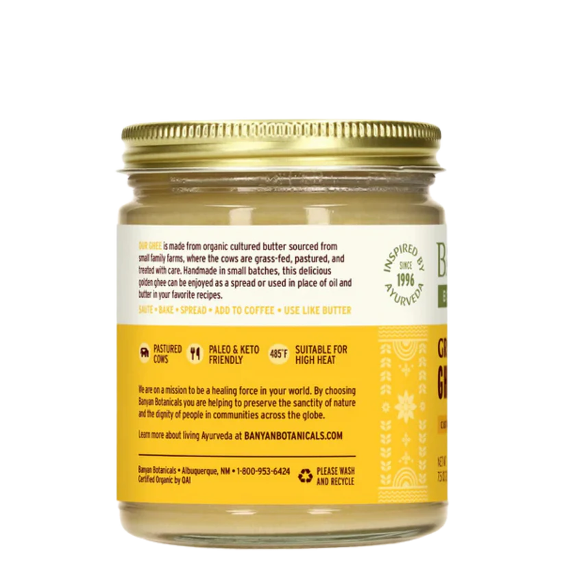 Our cultured ghee is made from the finest organic clarified butter from small family farms where the cows are pasture raised, grass-fed, and given loving care. Handmade in small batches, this creamy golden ghee makes a healthy and delicious alternative to butter and oil. With a high smoke point of 485°F, it is ideal for cooking, sautéing, and baking.