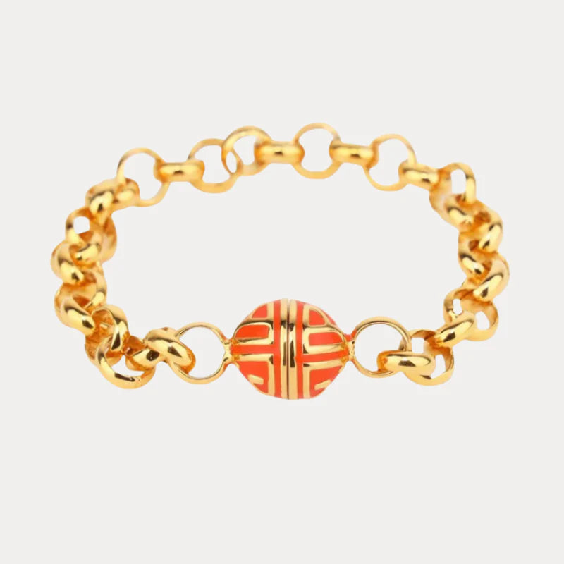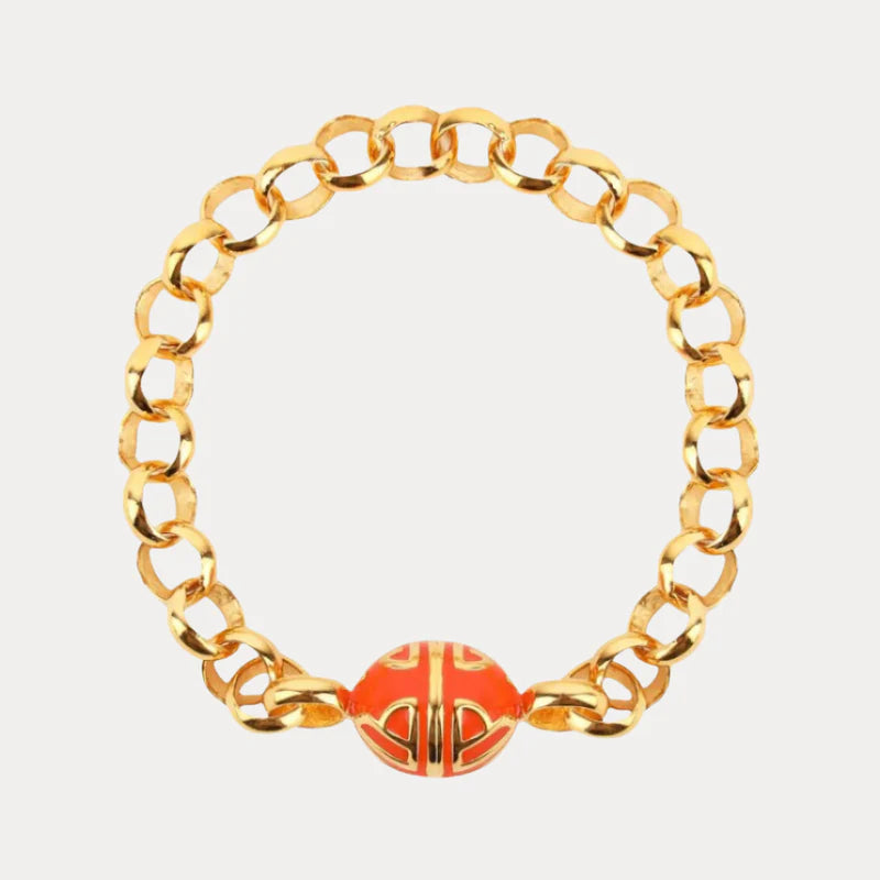 Our Flame Chain bracelet is already a classic. Expertly crafted links are hammered and twisted to form a chain that lays beautifully on your wrist. Then, we finish this beauty with our chop logo on an enamel magnetic closure for ease and simplicity. In vibrant “flame” orange, it is a must for the fashionista’s jewelry wardrobe. Handcrafted in Jaipur, India exclusively for BuDhaGirl. One size.