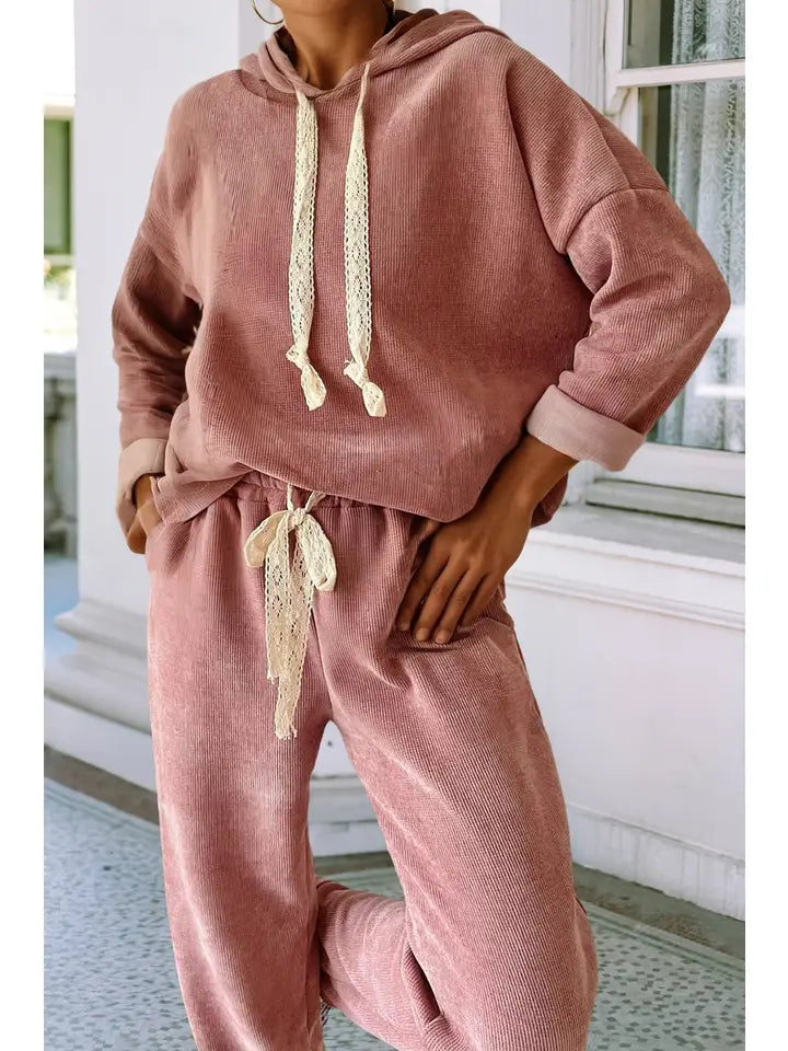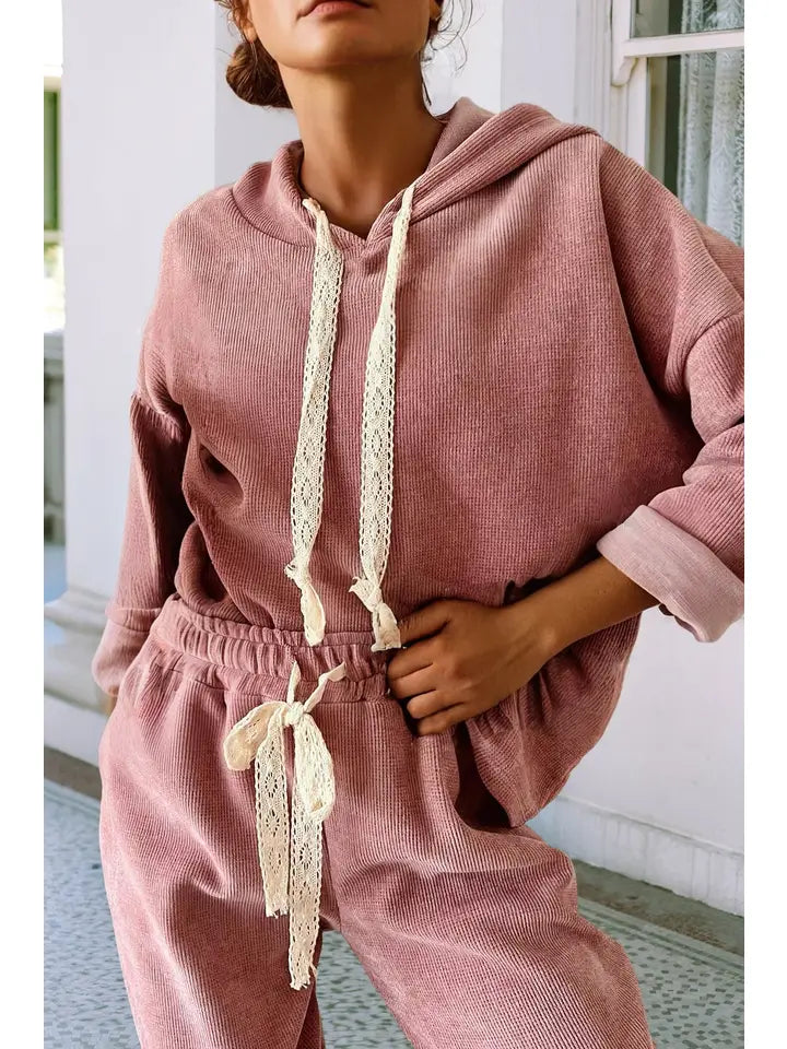 Detail Drawstring Pullover Hoodie and High Waist Pants Corduroy Suit Style Casual Pattern Solid Occasion Daily Season F/W β¨ Lace and leopard drawstring bring a chic touch to this set. π§₯ Includes a corduroy hoodie and matching pants for a coordinated look. π Loose-fit pullover with dropped shoulders meets high-waist tapered pants. π Easy-to-style set offers effortless fashion for any occasion. ποΈ Perfect for casual days or stepping out in contemporary street style.